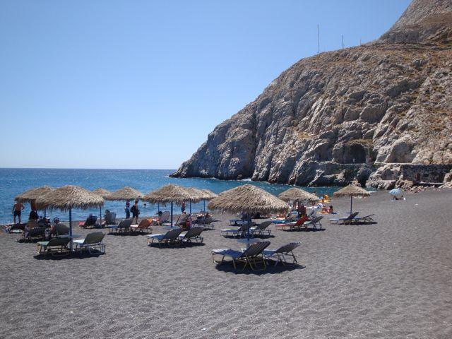 A sziget legfontosabb városai: Kamari, Fira, Oia és Perissa. Fira a sziget legnépesebb települése, építészete jellegzetes görög vonásokat mutat. A sziget fő turisztikai központja, hiszen a tenger felől érkező turisták mind ide érkeznek, válogathatnak a rengeteg étterem és szálláslehetőség közül, az egyszerű apartmanoktól a luxushotelekig. Kamari fekete homokos tengerpartjáról híres, csak 10 km-re található Firától. Több mint 2 kilométeres tengerpartja, népszerű tavernái vonzzák a turistákat, akik a nyüzsgő tengerparti sétányon rengeteg szórakozási lehetőségből választhatnak.